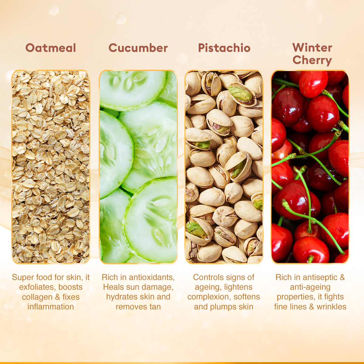 Reduces Tan: Helps lighten and even out skin tone. Brightens Skin: Restores the skin's natural glow and radiance. Deep Cleansing: Removes dirt, oil, and impurities. Nourishes & Hydrates: Moisturizes and replenishes skin for a fresh feel.